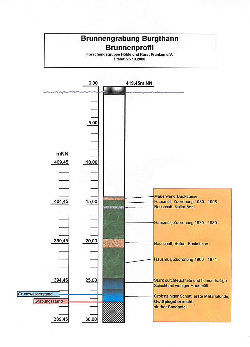 In den nächsten Tagen werden wir von den Brunnenwänden eine Fotodokumentation anfertigen und einen umfassender Bericht erstellen und nach wie vor ist ein öffentlicher Vortrag in Burgthann geplant, bei dem die Bevölkerung über die „Geheimnisse“ informiert wird, die während der Grabungsarbeiten gelüftet werden konnten – denn wie jeder Brunnen, so hatte auch der Burgbrunnen in Burgthann sein Geheimnis.